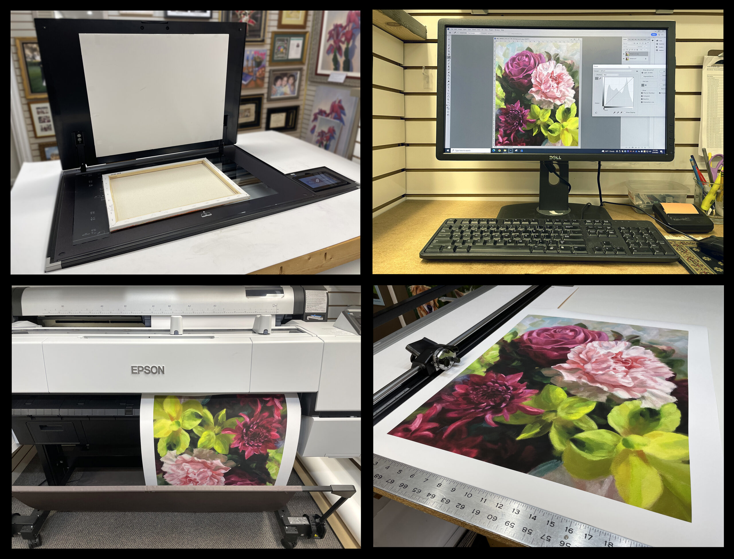 We safely capture your original image with our high resolution digital flatbed scanner, accommodating most any size. Our professional scanner sees and records every detail of texture and color.